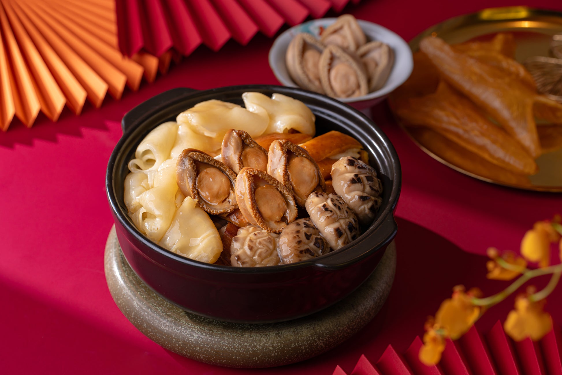 • Ingredients: Whole South African Abalone (8-head), Fish Maw, Shrimp Balls, Roasted Duck, Marinated Chicken in Soy Sauce, Braised Pork Knuckle in Loh-Sui Sauce, Shiitake Mushrooms, Tofu Puffs, Turnip, Lotus Root (Served in a reusable pot, which can be reheated with an induction cooker or open flame.)